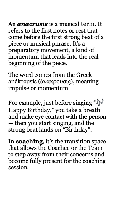 2 pages explaining what an « anacrusis » is and how it connects to coaching or leading a discussion